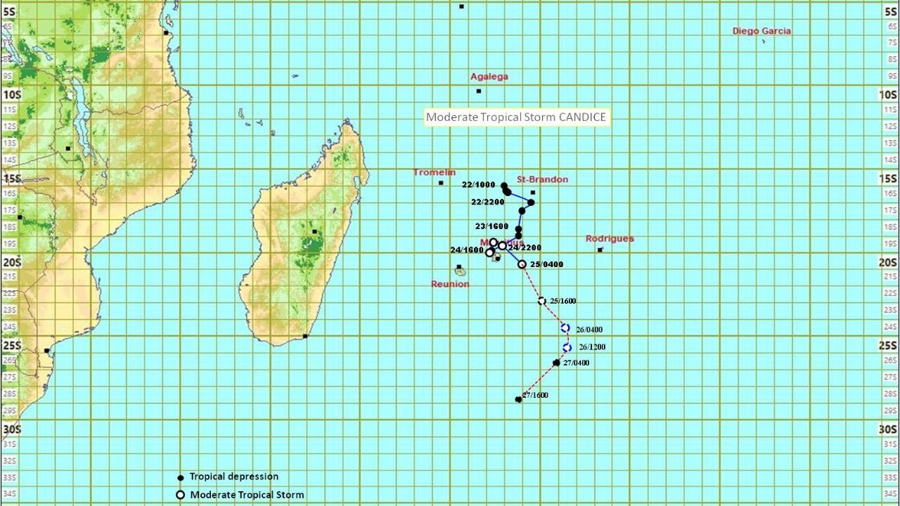 « Puisque des vents très forts existent toujours dans le secteur nord de la tempête et que de fortes averses pourraient persister sur l'île jusqu'à cet après-midi, Candice reste une menace potentielle pour l'île », indique le service météo. Il est conseillé au public de prendre toutes les précautions nécessaires.