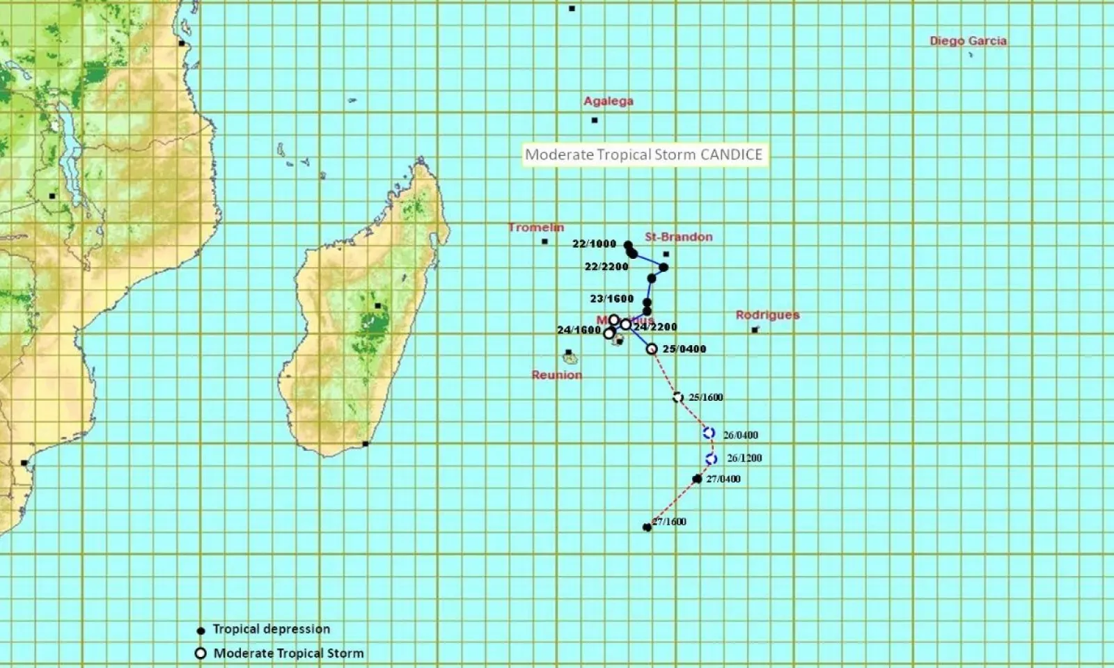 Un avertissement de cyclone de classe 2 reste en vigueur à Maurice. Treizième bulletin de cyclone émis à 10 h 10 ce jeudi. À 10 h, la tempête tropicale modérée Candice était centrée à environ 270 km au sud-est de Blue-Bay autour du point 22.0 degrés sud en latitude et 59.5 degrés est en longitude.