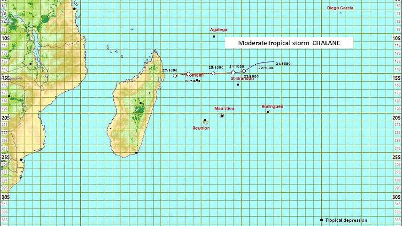 A 10 h, Chalane était située à environ 600 km au nord-nord-est de Maurice. Elle se déplace lentement vers l’ouest en direction du nord-est de Madagascar. Sur cette trajectoire, elle ne représente pas une menace directe pour Maurice.