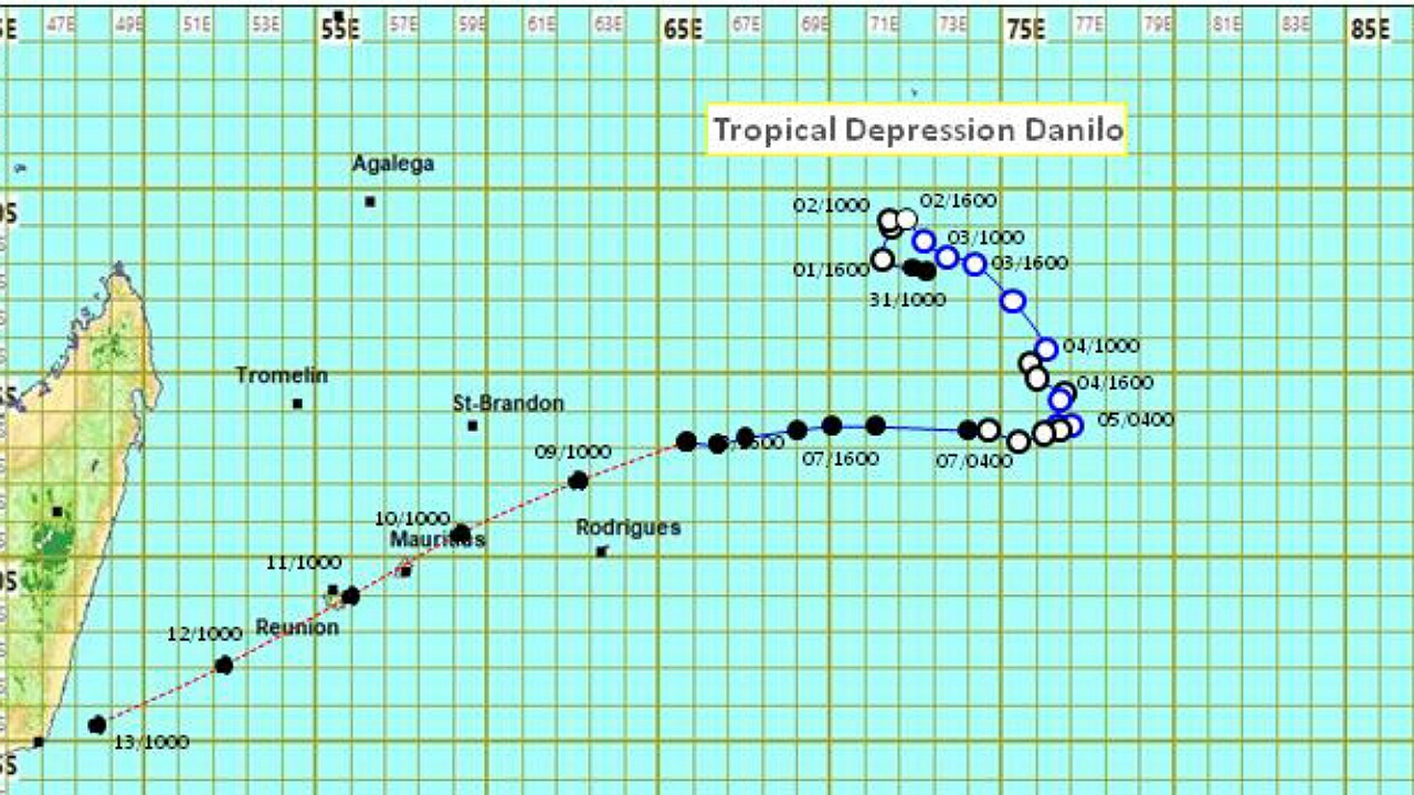 « A 04h00, la dépression tropicale Danilo était centrée autour du point 17.5 degrés Sud en latitude et 64.2 degrés Est en longitude soit à environ 740 km à l'est-nord-est de Maurice. Elle se déplace dans une direction générale de l'Ouest à environ 20 km/h », indique la station météorologique de Vacoas dans son communiqué émis ce samedi matin.