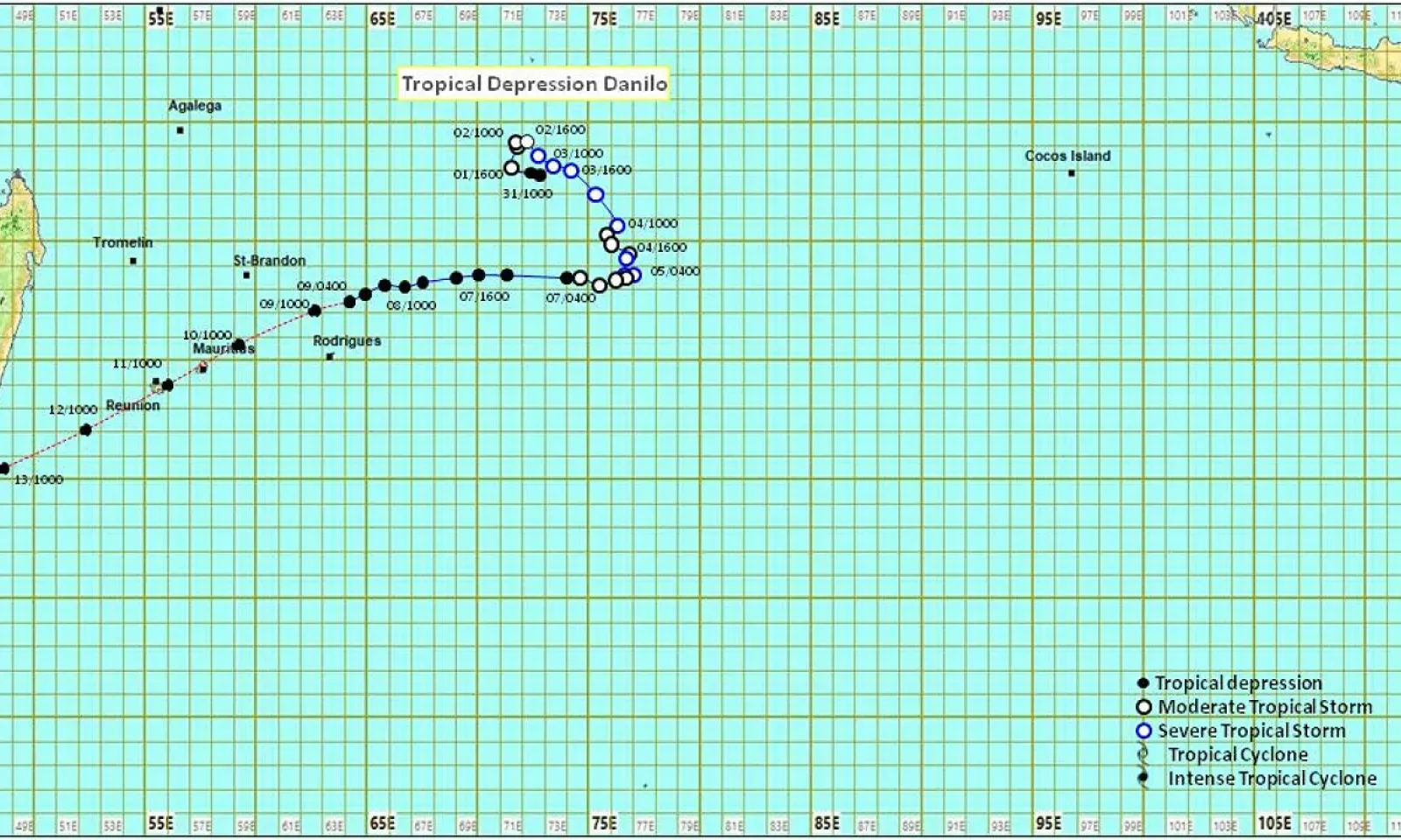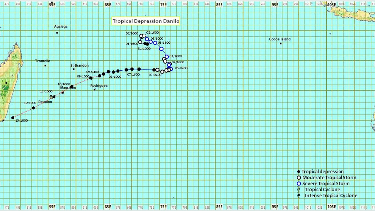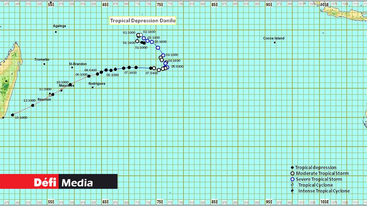 À 10h ce samedi matin, Danilo était centrée à environ 700 kilomètres à l’Est-Nord-Est de Maurice à une latitude de 17,4 degrés Sud et une longitude de 63,9 degrés Est. La perturbation tropicale se dirige vers l’Ouest à une vitesse d’environ 20 kilomètres par heure.
