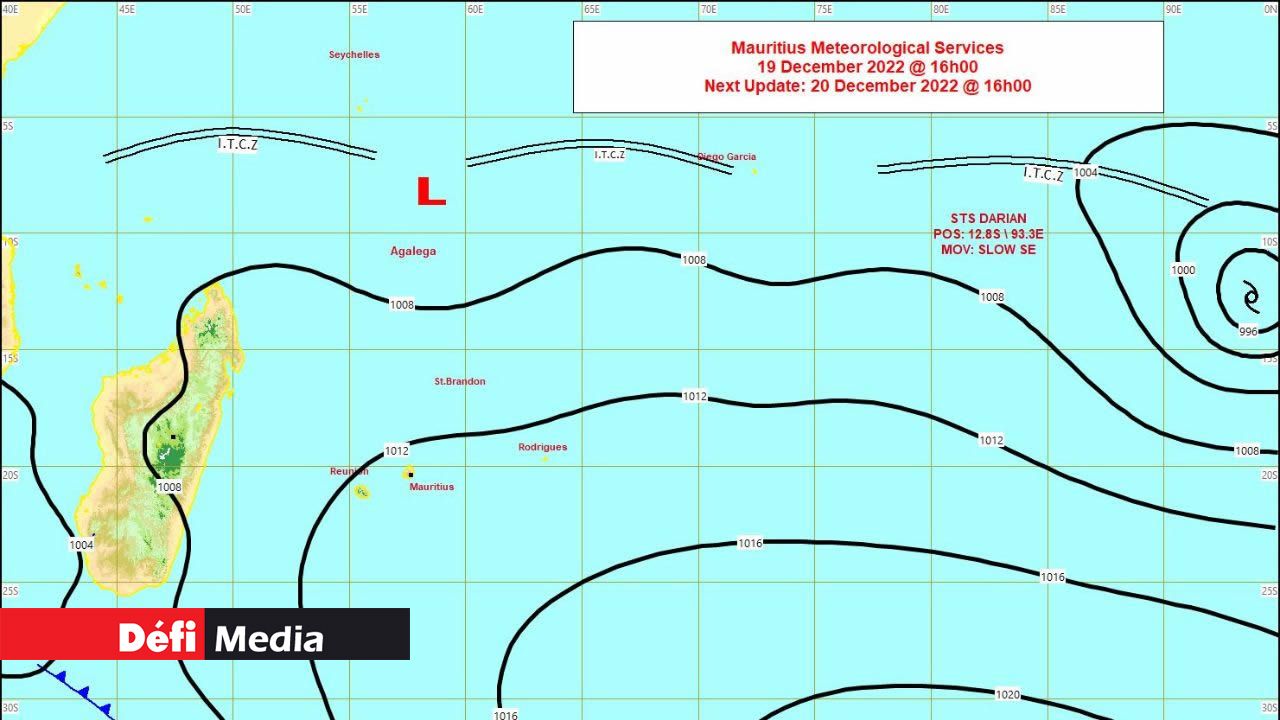 La forte tempête tropicale modérée Darian s'est intensifiée en un cyclone tropical durant la nuit. Il évolue à plus de 3 000 km à l'est-nord-est des Mascareignes. Pour les prochains sept jours, ce système évoluera très loin de la région et n'influencera pas le temps sur les îles Mascareignes.