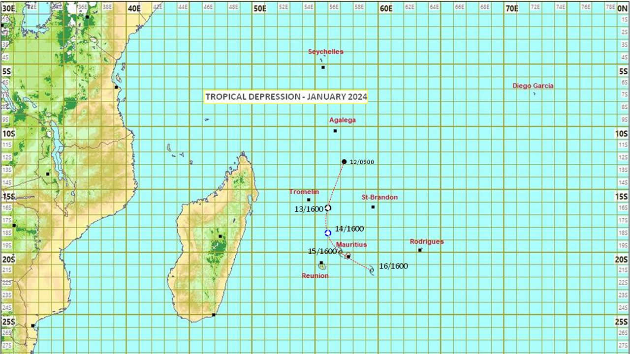 Des conditions cycloniques, avec des rafales de vents dépassant les 120 km/h, devraient se faire sentir ce lundi 15 janvier si la dépression tropicale, qui devrait être nommée « Belal », commence à s’intensifier ce samedi matin, tout en se rapprochant de Maurice. C’est ce que laisse entendre le Mauritius Meteorological Services (MMS) dans son dernier bulletin émis à 16h30 le vendredi 12 janvier. Le futur Belal se trouvait alors à environ 450 km au Nord-Ouest de St Brandon et 720 km au Nord de Maurice, se déplaçant en direction de l'Ouest à une vitesse de 15 km/h. Les nuages actifs associés aux bandes externes de la dépression tropicale devraient commencer à influencer le temps à Maurice à partir de cet après-midi.