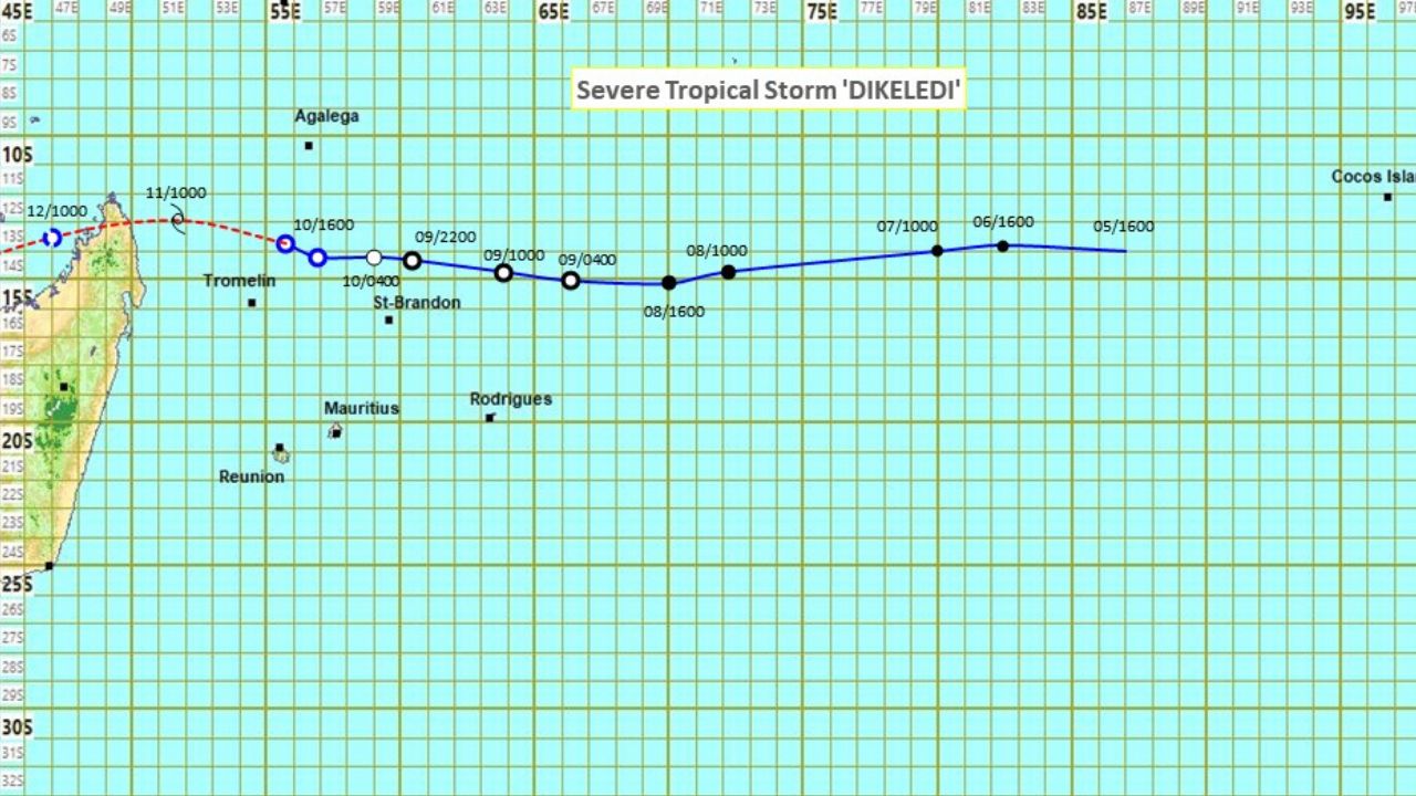 À 16 heures, la forte tempête tropicale Dikeledi était centrée en latitude 13.7 degrés Sud et en longitude 55.7 degrés Est.