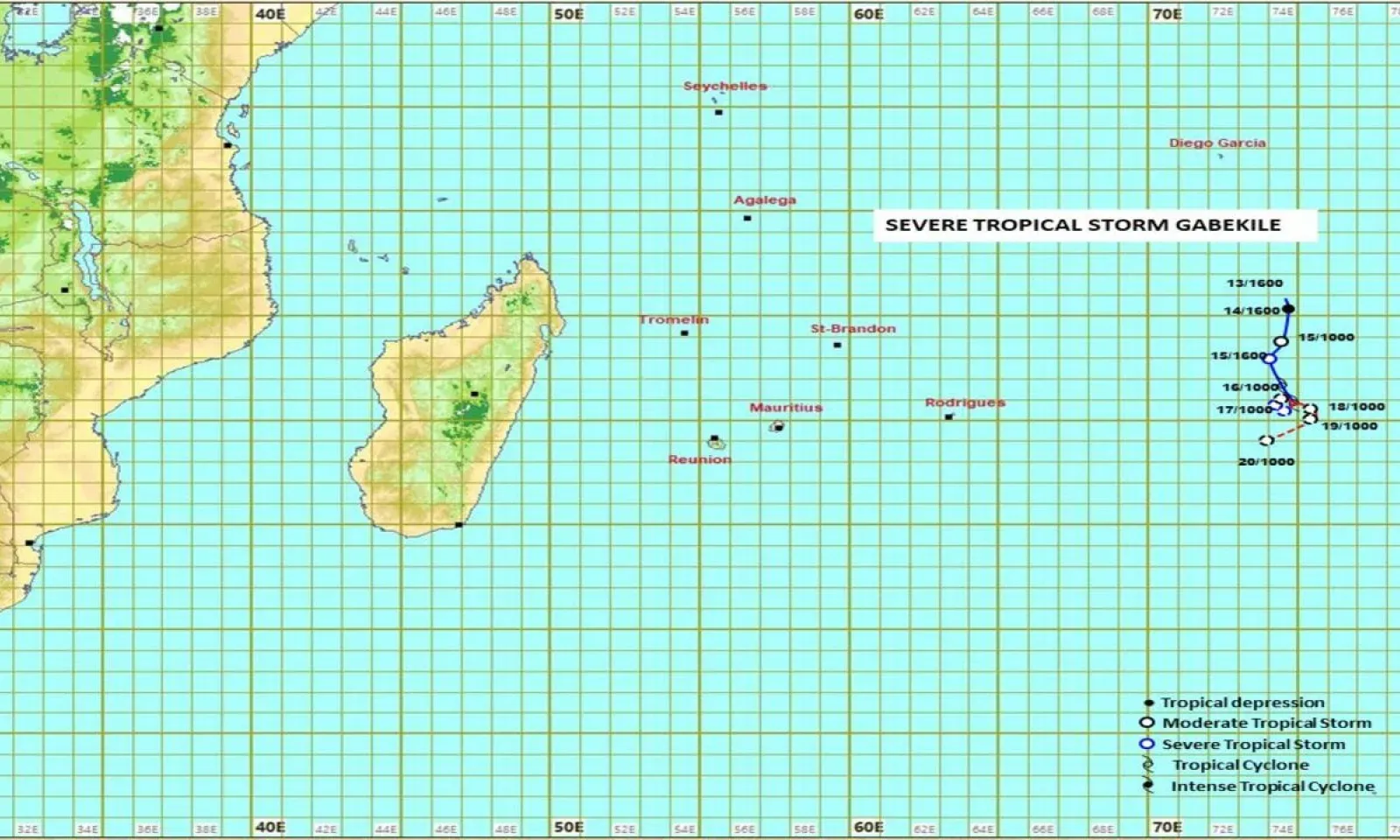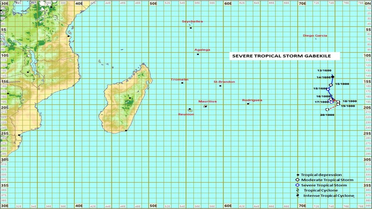 Le cyclone Gabekile s'est affaibli en une forte tempête tropicale durant les dernières heures. A 16h00, elle était centrée autour du point 20.2 degrés sud en latitude et 75.0 degrés est en longitude, soit à environ 1785 km à l'est de Maurice.