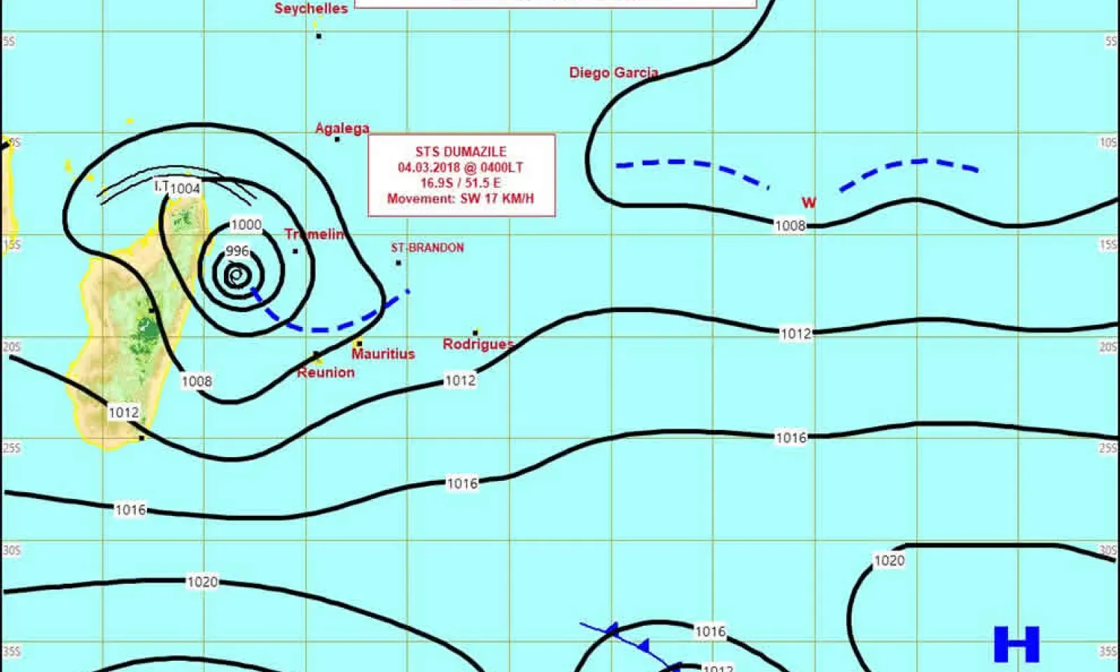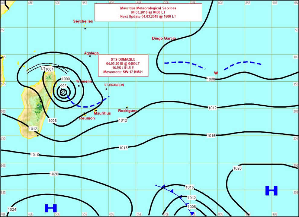 La tempête tropicale modérée Dumazile s'est intensifiée dans la nuit. Elle est passée au stade de forte tempête tropicale. A 4 h ce dimanche, elle se trouvait à 720 km au nord-ouest de Maurice. Elle se déplace dans une direction générale du sud-ouest à environ 17 km/h, indique la station météorologique de Vacoas dans un communiqué émis ce dimanche matin 4 mars.