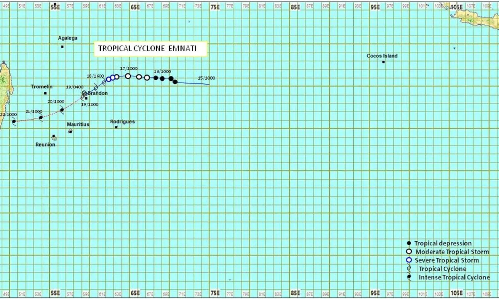 « À midi, le cyclone tropical Emnati était centré à environ 440 km au nord-nord-est de l'île Maurice. Il continue de se déplacer vers le sud-ouest à environ 17 km/h. Il passera à environ 275 km au nord-nord-est de Maurice demain matin, dimanche 20 février, à sa distance la plus proche », indique la station météo de Vacoas par le biais d’un communiqué spécial émis à 12 h 30, ce samedi 19 février.