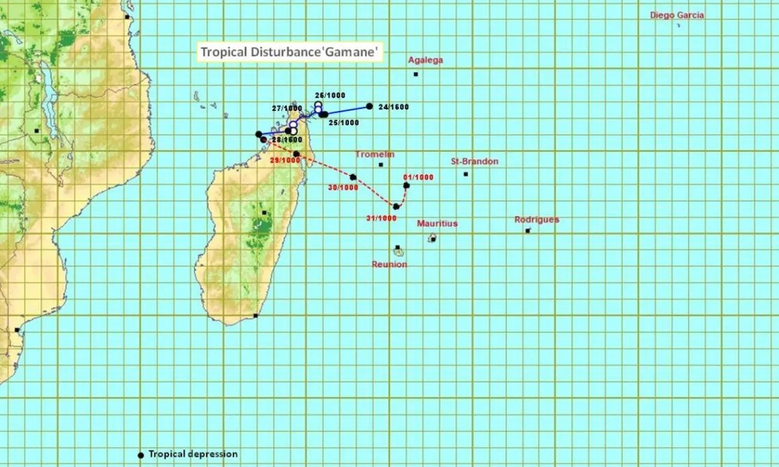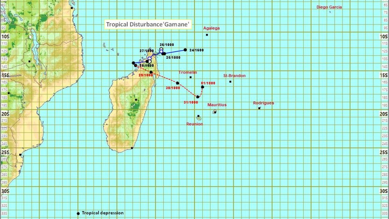 Gamane dans le canal du Mozambique tôt ce matin, dans un état très faible et désorganisé. À 04h00 ce matin, elle était centrée à plus de 1000 km au nord-ouest de Maurice.