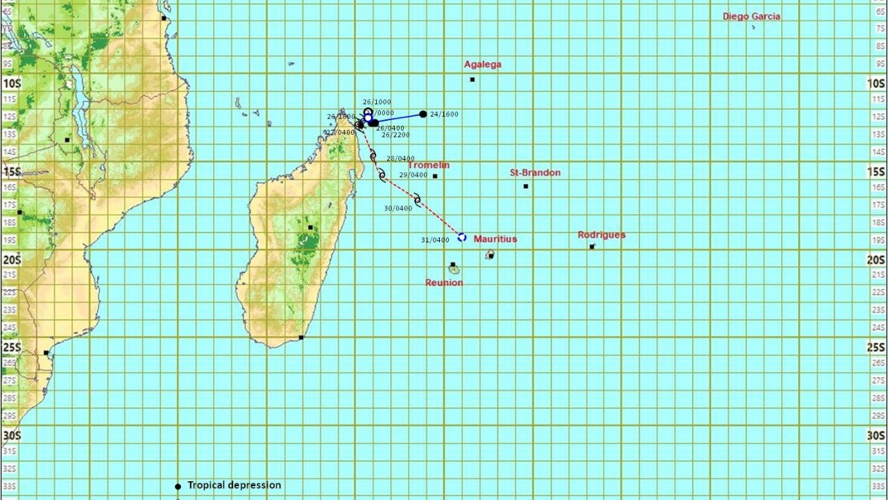À 04 h 00 ce matin, Gamane était centrée autour du point 12.9'S et 50.1'E à environ 1 130 km au nord-ouest de l'île Maurice. Elle se déplace vers l'ouest-sud-ouest à environ 6 km/h.