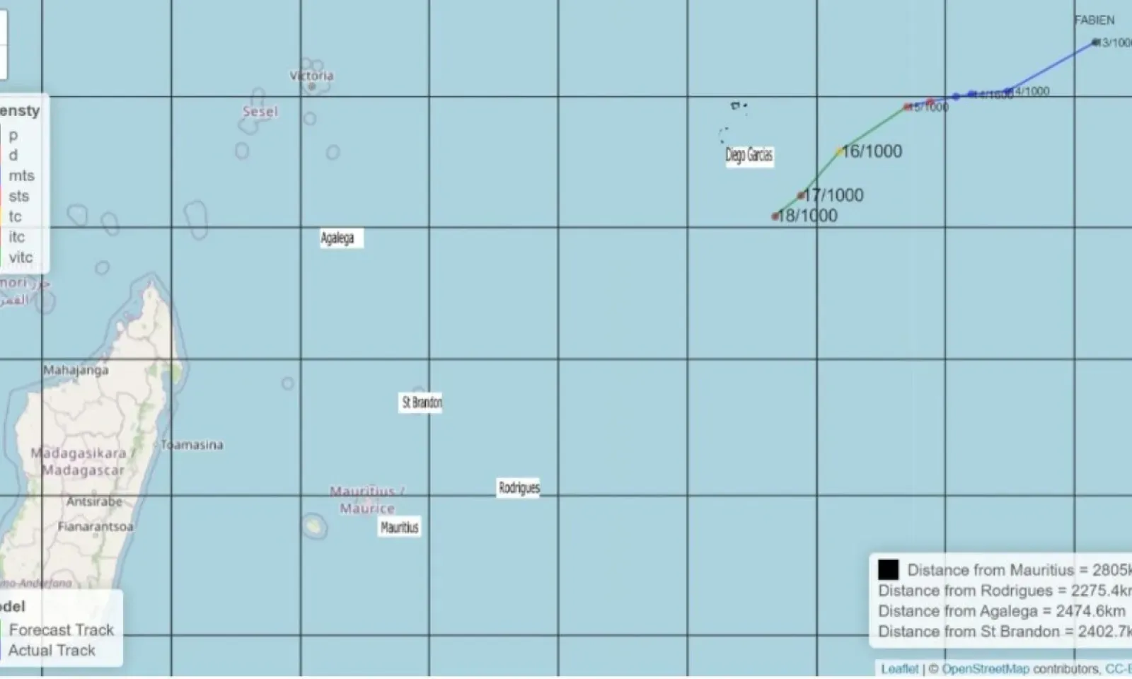 Il est important de souligner qu'à 10h ce lundi, la forte tempête tropicale Fabien se trouvait à environ 2 800 km au nord-est de Maurice. Elle se déplace vers l'ouest à une vitesse d'environ 20 km/h. Cependant, elle n'affecte pas les conditions météorologiques de notre région, comme l'indique le bulletin de prévisions de la station météorologique de Vacoas, publié aujourd'hui à 11h30.