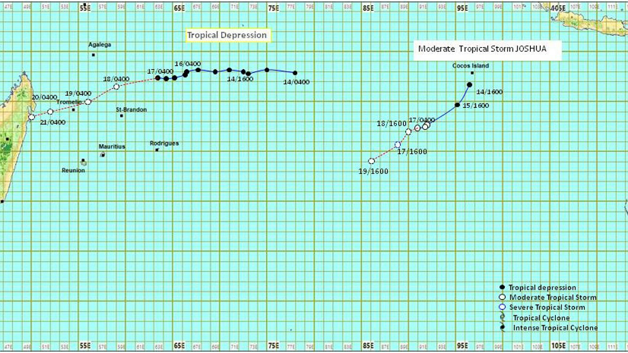À 10 heures la tempête tropicale modérée Joshua, centrée vers le point 18,4 ° de latitude sud et 90,3 ° de longitude, se déplaçait dans une direction générale de l'ouest-sud-ouest à environ 13 km/h. Elle n'influencera pas le temps sur notre région.