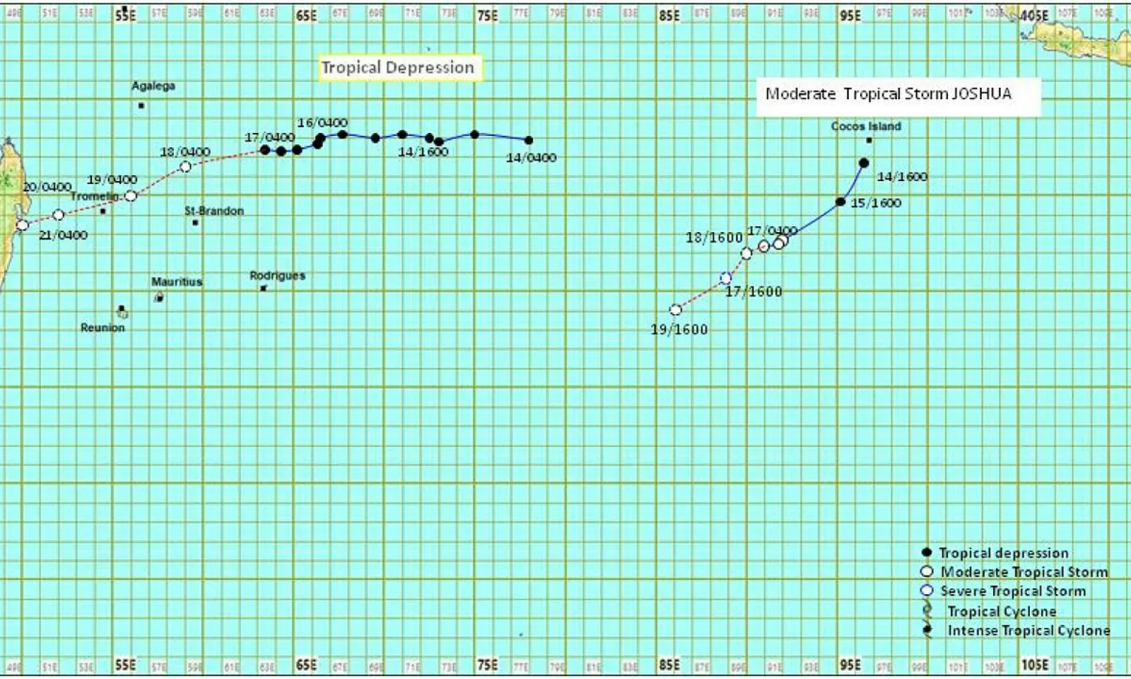 Quant à la tempête tropicale modérée, Joshua, elle évolue très loin presque à l'est des îles Mascareignes. A 04h00, elle était centrée autour du point 17.6 degrés Sud en latitude et 91.0 degrés Est en longitude. Elle se déplace dans une direction générale de l'ouest-sud-ouest à environ 15 km/h.