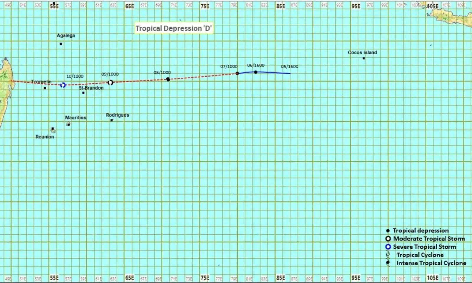 À 04h00, la dépression tropicale était centrée autour du point 14,5 degrés sud en latitude et 75,0 degrés est en longitude, soit à environ 1 955 km à l'est-nord-est de Maurice. Elle se déplace vers l'ouest à une vitesse accélérée d'environ 25 km/h. Cette dépression ne représente aucune menace directe pour Maurice.