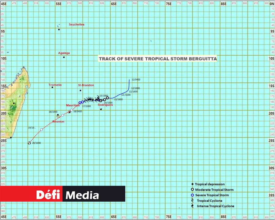 A 1 heures, Berguitta était centrée à environ 165 km au nord-est de Maurice, en latitude 19,1 degrés Sud et longitude 58,9 degrés Est. «Elle se déplace maintenant vers le sud-ouest à une vitesse d'environ 10 km/h. Sur cette trajectoire, la forte tempête tropicale Berguitta se dirige directement sur Maurice et le centre passera très près de l'île ce matin. Vu son intensité, sa position par rapport à Maurice et son déplacement, la forte tempête tropicale Berguitta représente une menace imminente pour Maurice», prévient la station météorologique de Vacoas. Le temps à Maurice restera couvert avec des fortes pluies intermittentes et des orages.