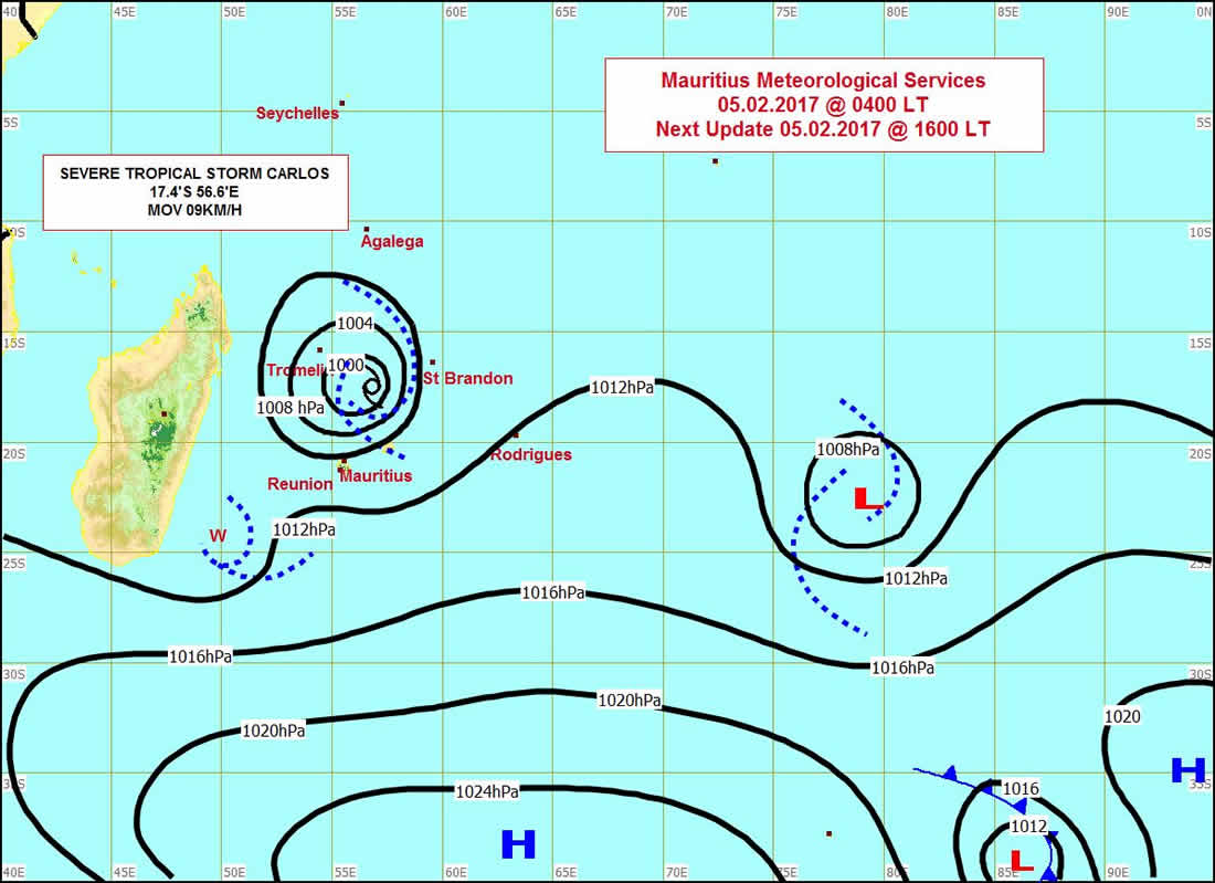 La forte tempête tropicale Carlos se trouvait à 10 h ce dimanche 5 février à 300 kilomètres presqu’au nord de Maurice.