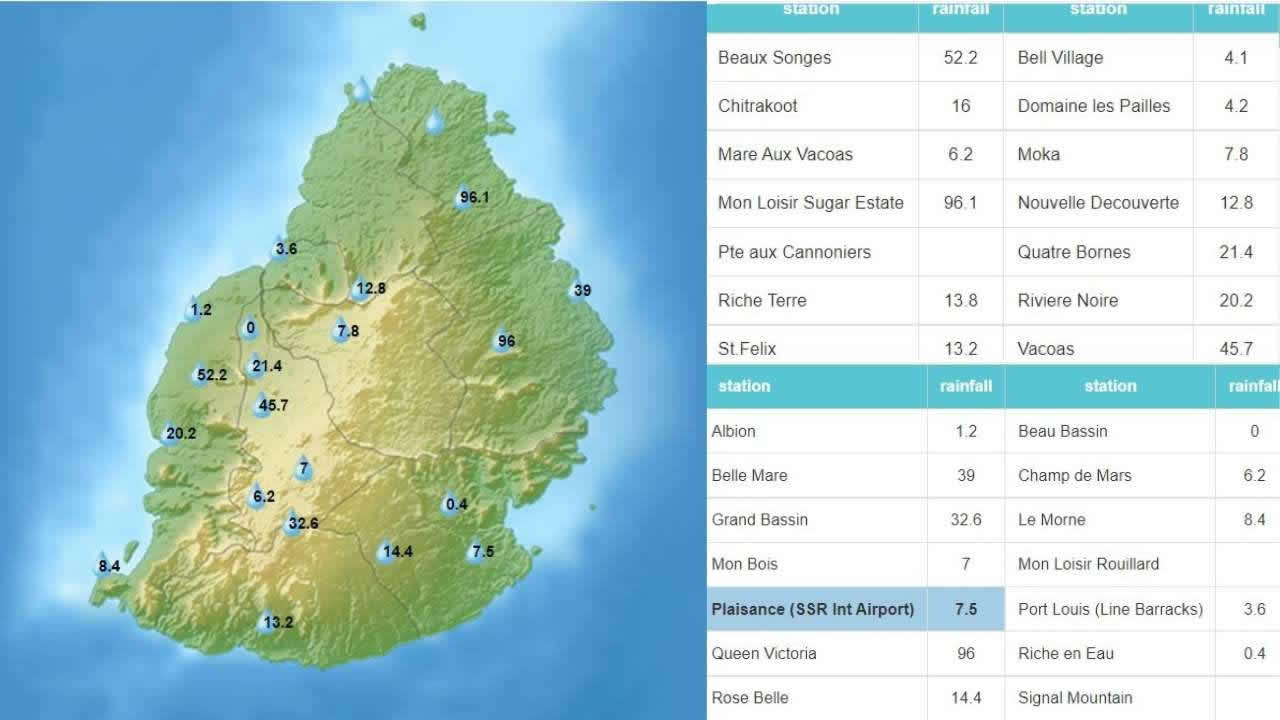 Mon Loisir Sugar Estate a enregistré 96,1 mm de pluie durant les dernières 24 heures jusqu'à 4 heures du matin ce samedi. Cette région située dans le Nord a recueilli la plus forte pluviométrie suivie de Queen Victoria (dans l’Est) avec 96 mm. Un avis de fortes pluies a été emis à 2h15 ce matin. Avis valable jusqu'à 10 heures.