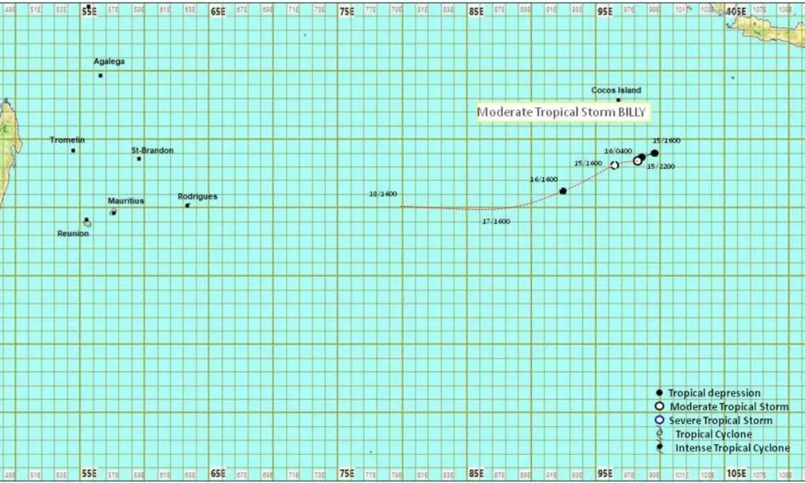 Elle a été baptisée Billy. La dépression tropicale évoluant dans la région australienne s'est intensifiée en une tempête tropicale modérée dans la nuit. Ce système évolue à plus de 3 000 km à l'est-nord-est de notre région. Selon la station météo de Vacoas, Billy devrait s'affaiblir dans les prochains jours en se déplaçant vers l'ouest et n'influencera pas le temps sur les Mascareignes.