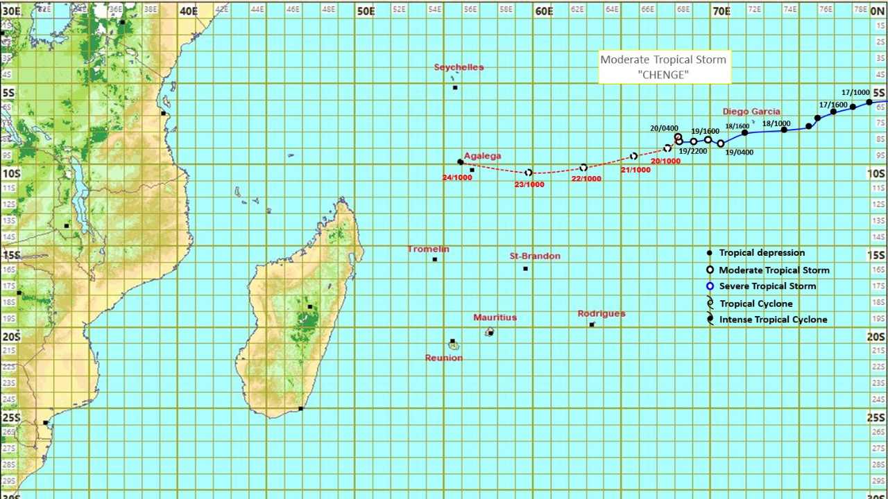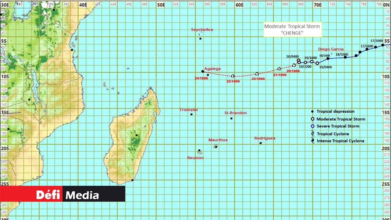 À 04h00 ce lundi 20 octobre, la tempête tropicale modérée “Chenge” était centrée à environ 1 280 km à l’est-nord-est d’Agalega. Elle se déplace actuellement vers l’ouest-sud-ouest à une vitesse d’environ 10 km/h, se rapprochant ainsi d’Agalega.