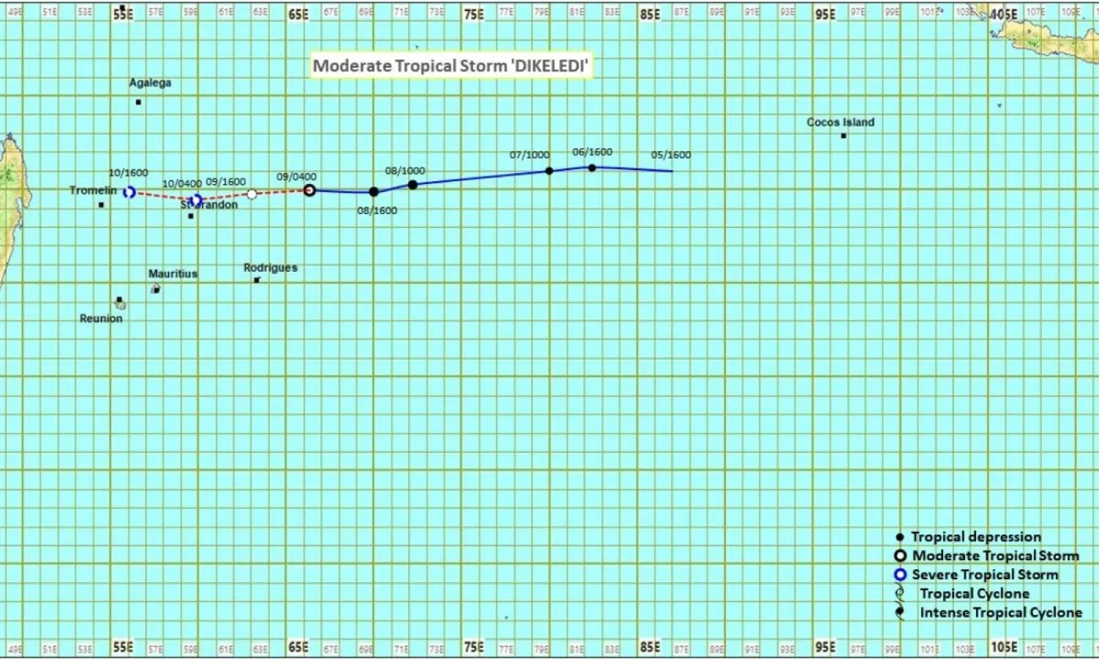 La dépression tropicale qui évoluait à l'est-nord-est de Saint-Brandon s'est intensifiée en une tempête tropicale modérée dans la nuit. Elle a été baptisée Dikeledi par les services météorologiques de Maurice à 4h00 ce jeudi 9 janvier 2025.