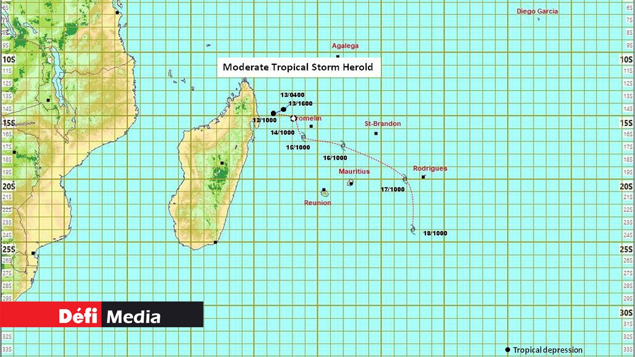 A 04h00 ce matin, Herold se trouvait à environ 850 km au nord-ouest de Maurice. La tempête tropicale modérée est pour le moment quasi-stationnaire.