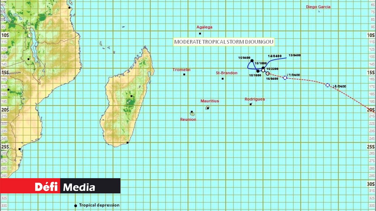 À 04 h, elle était centrée à environ 975 km à l'est-nord-est de Maurice, soit autour du point 15.7 degrés sud en latitude et 65.6 degrés est en longitude. Elle se déplace vers le sud-est à environ 12 km/h. Djoungou devrait donc s’éloigner de notre région selon les prévisions de trajectoire.