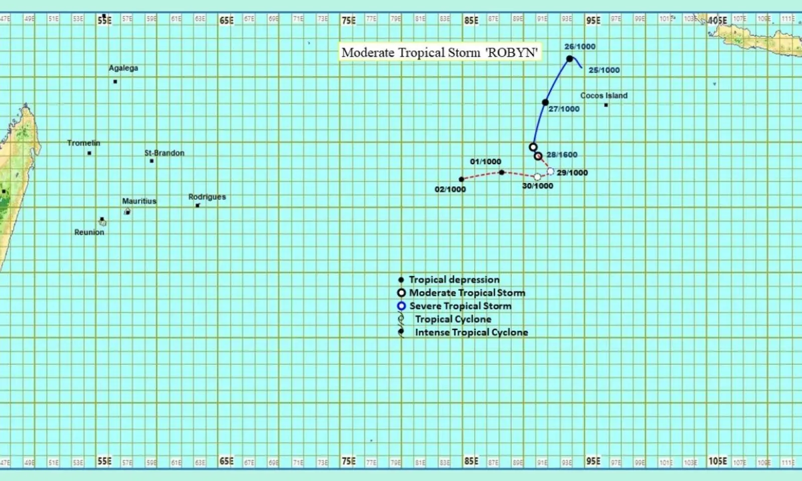 La dépression tropicale évoluant dans la zone de responsabilité de l’Australie s’est intensifiée pour devenir une tempête tropicale modérée. Elle a été nommée Robyn par les services météorologiques australiens. Ce système se situe très loin à l'est-nord-est des Mascareignes et n’aura aucune influence sur le temps dans notre région, indique la station météorologique de Vacoas.