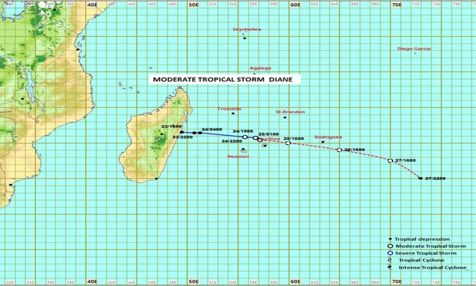 «Les observations du radar indiquent que la tempête tropicale modérée Diane est déjà passée à son point le plus rapproché de Maurice, à environ 40 km au nord de Cap Malheureux. A 04h00, elle était centrée à environ 55 km au nord-est de Maurice, soit en latitude 19.8 degrés sud et longitude 58.2 degrés est. Les observations du vent et la pression atmosphérique sur Maurice confirment que la tempête tropicale modérée a commencé à s'éloigner de l'île. Elle maintient son déplacement de l'est-sud-est à environ 25 km/h. Sur cette trajectoire, les risques d'avoir des rafales de l'ordre de 100 km/h a considérablement diminué. Conséquemment, l'avertissement de cyclone pour Maurice a été enlevé», explique la station météorologique de Vacoas dans son bulletin.