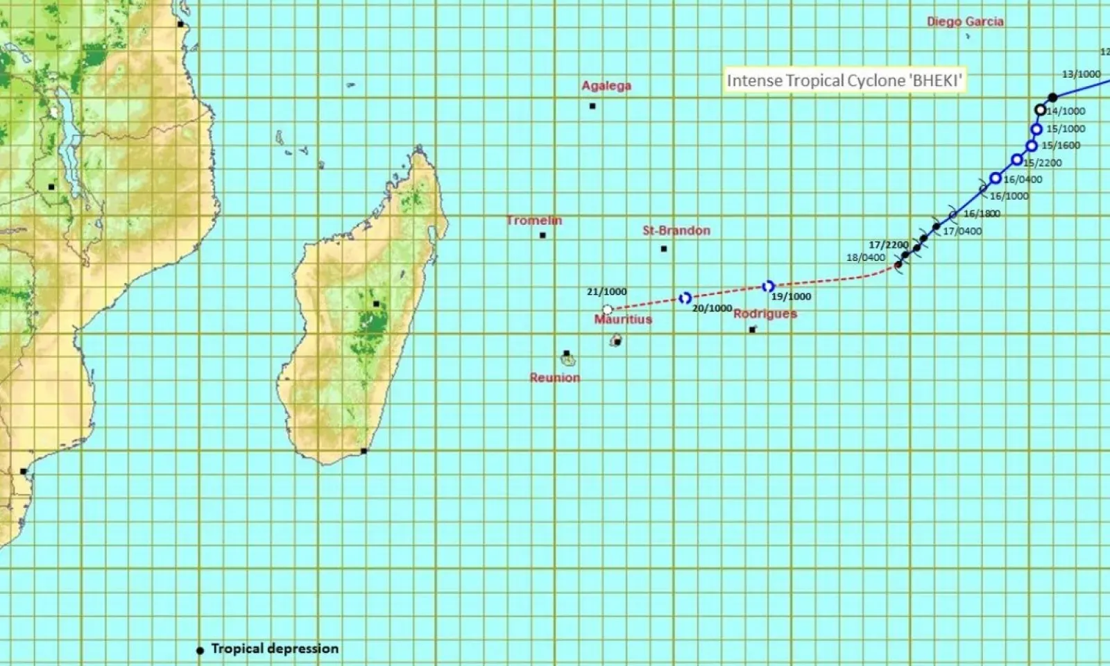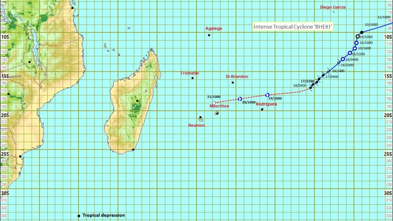 À 4 h 00 ce matin, le cyclone tropical intense Bheki était centré autour du point 17,1 degrés sud en latitude et 69,5 degrés est en longitude, soit à environ 1 310 km à l'est-nord-est de Maurice. Il se déplace en direction du sud-ouest à une vitesse d’environ 10 km/h.