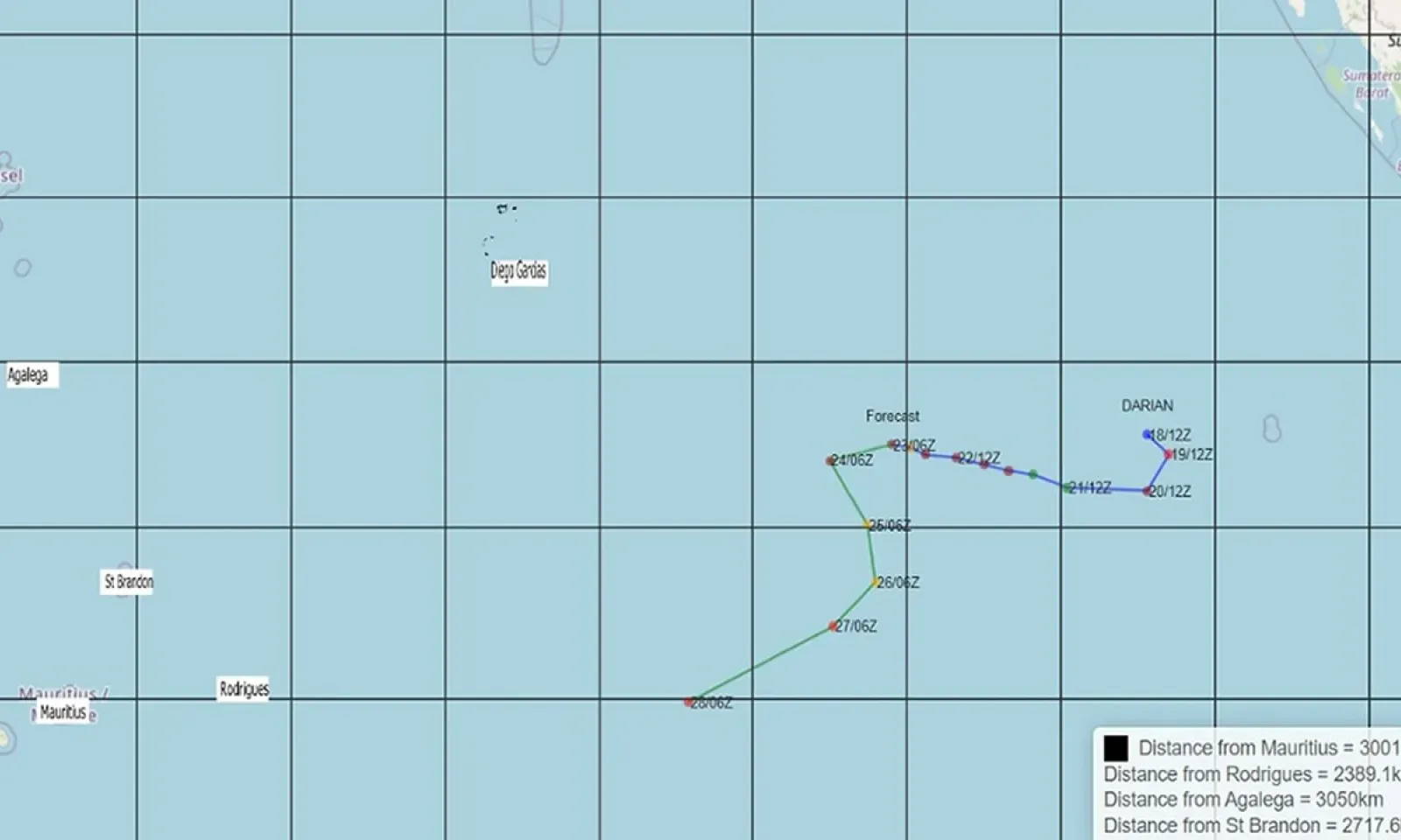 À 10 h ce vendredi, il évoluait à environ 3 000 km à l'est-nord-est de Maurice. Darian se déplace vers Ouest-Nord-Ouest à une vitesse de 13 km/h.