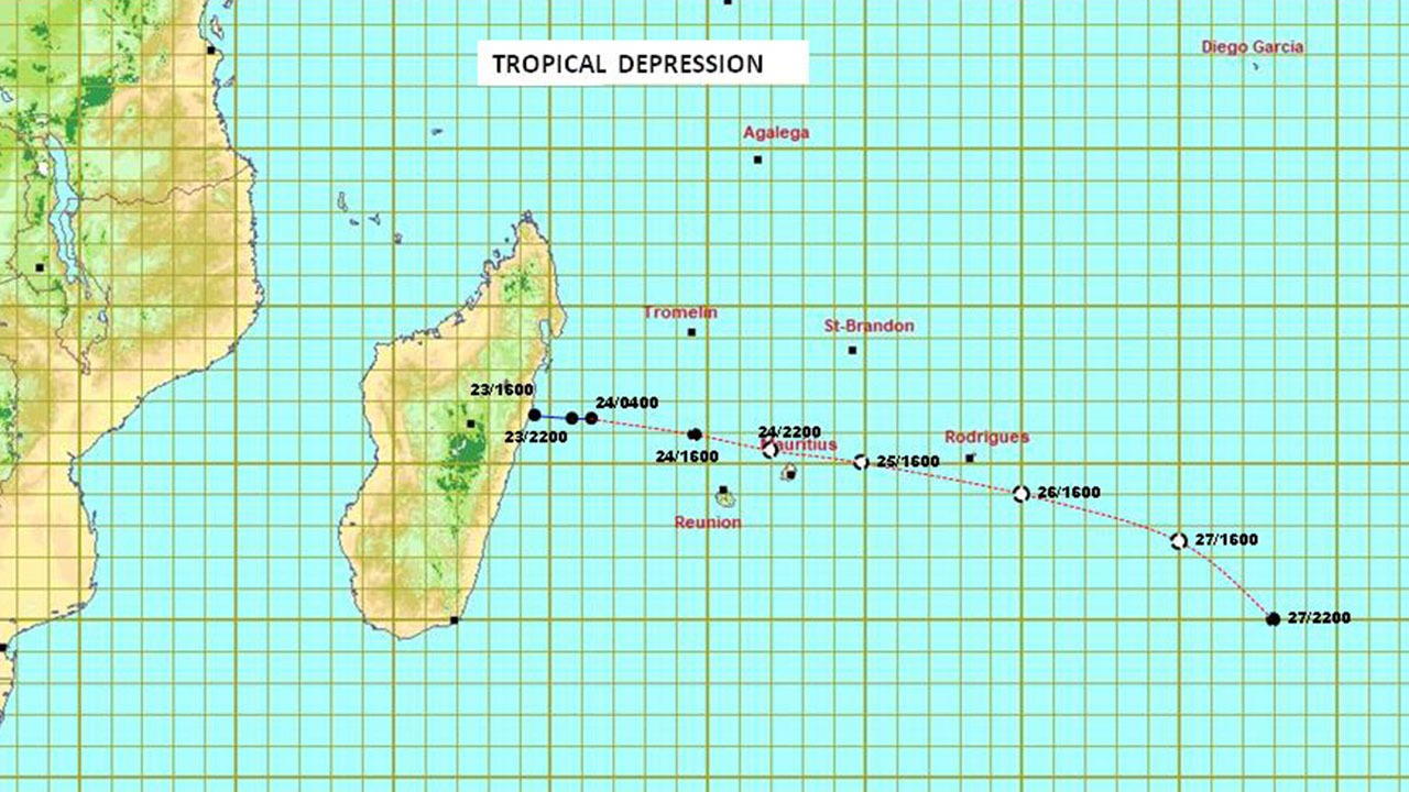 A 16 h, la dépression tropicale était située à 280 km à l'ouest-nord-ouest de Maurice. Elle se déplace dans une direction générale de l'est à une vitesse de 25 km/h. Sur cette trajectoire, son centre devrait passer à 50 km au nord de Maurice tôt demain matin.