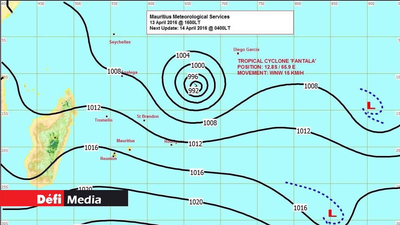 La forte tempête tropicale Fantala s’est intensifiée en un cyclone tropical. À 16 h 30 mercredi 13 avril, il se trouvait à 1 170 km au nord-ouest de l’île Maurice.Fantala se déplace dans une direction générale de l'ouest-nord-ouest à 15 km/h.
