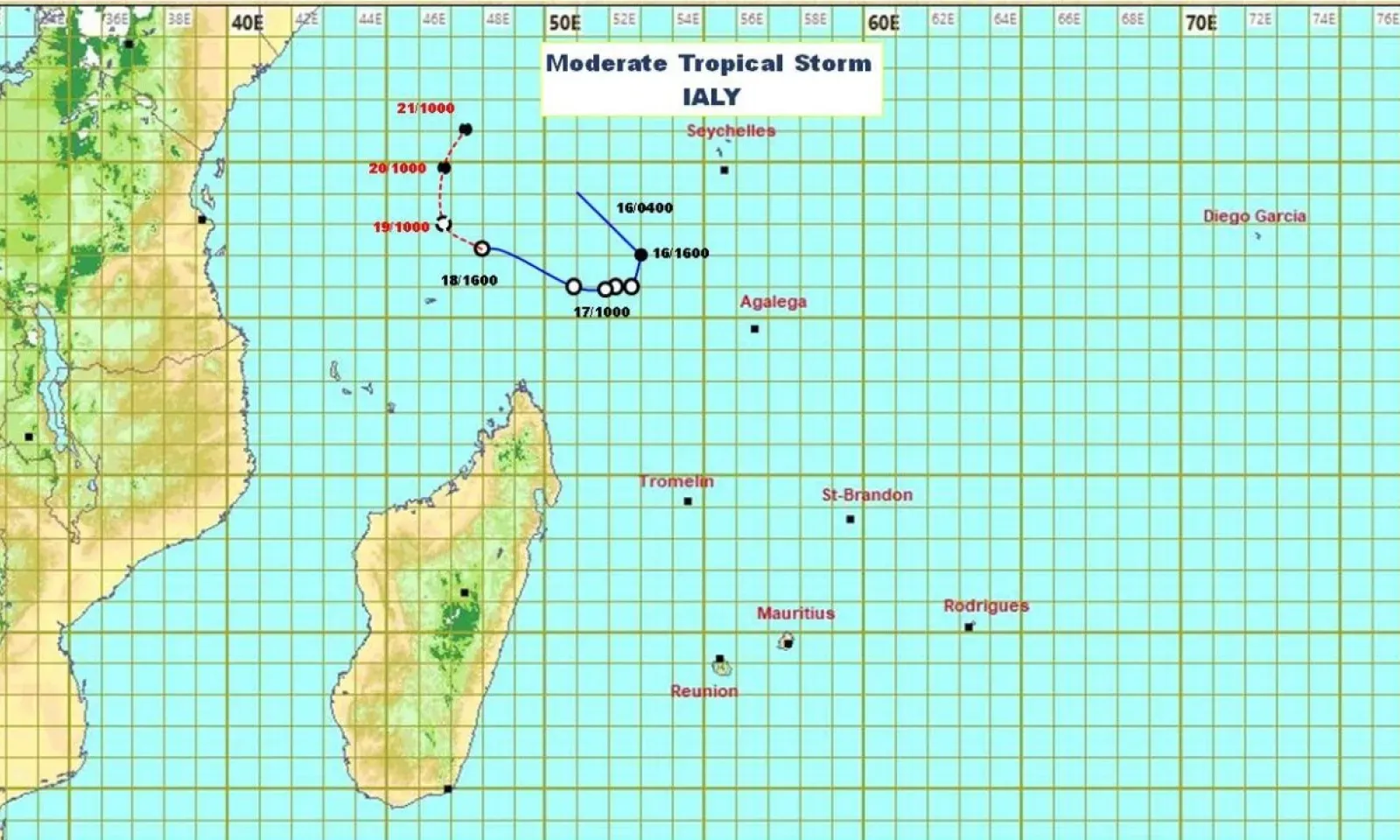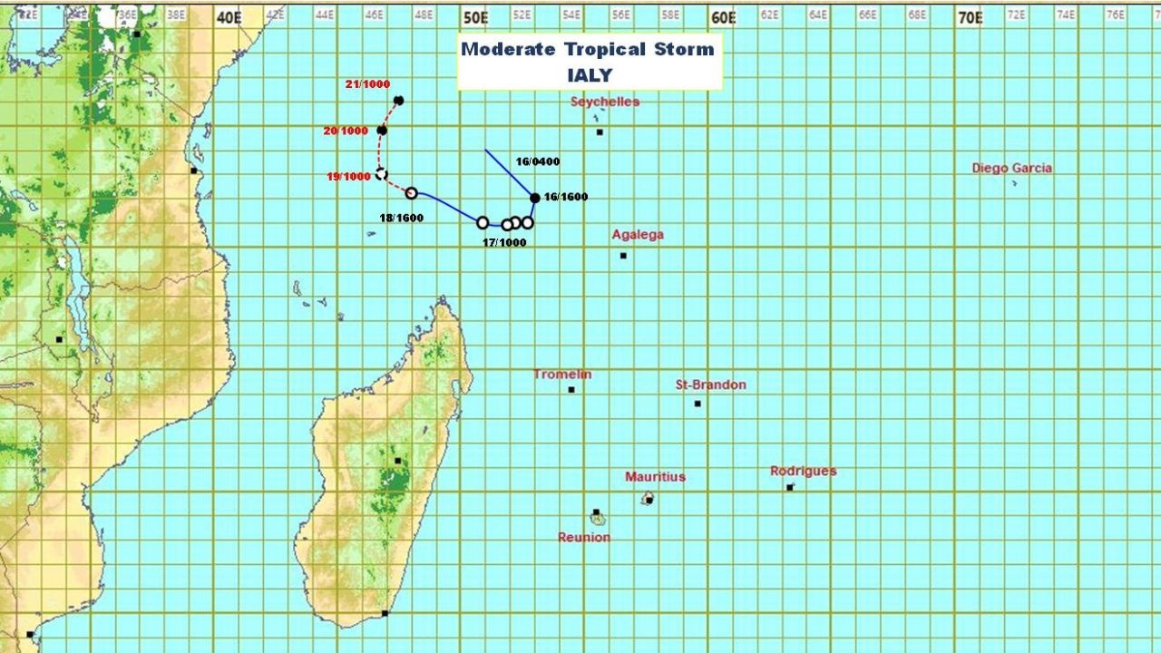 Durant ces dernières heures, la tempête tropicale modérée Ialy évoluant au nord-nord-ouest de Madagascar s'est intensifiée en forte tempête tropicale. Elle se déplace en direction de l'ouest-nord-ouest à environ 15 km/h et n'influencera pas le temps sur les îles des Mascareignes. Une perturbation tropicale évolue au nord de Diego Garcia. Elle évolue dans des conditions relativement favorables et pourrait s'intensifier davantage.