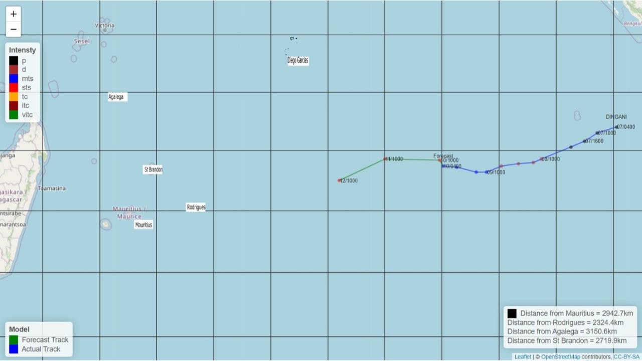La tempête tropicale modérée Dingani se trouve à environ 2 320 km à l'est-nord-est de Rodrigues. Ce système ne présente pas de danger pour les Mascareignes pour les prochains trois jours.