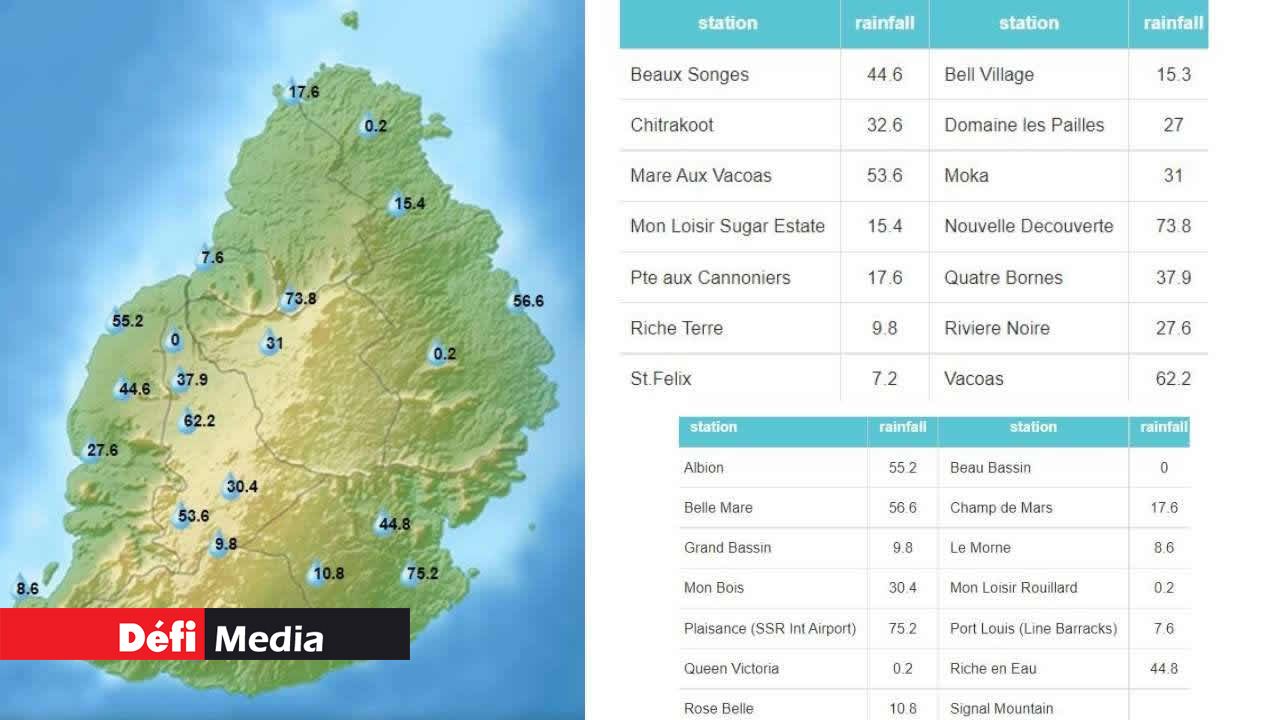 Quant aux endroits ayant enregistré la plus faible pluviométrie, ils sont Rose-Belle (10.8 mm), Grand-Bassin (9.8 mm), Riche-Terre (9.8 mm), Le Morne (8.6 mm), Port-Louis (7.6 mm), St Félix (7.2 mm) et Mon Loisir Rouillard (6.2 mm). Il n’a presque pas plu à Queen Victoria (0.2 mm) et Beau-Bassin (0 mm).