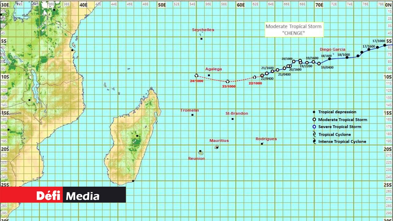 À 04h00 ce matin, CHENGE était centrée autour du point 10,4° Sud / 63,4° Est, soit à environ 735 km à l’est d’Agalega.