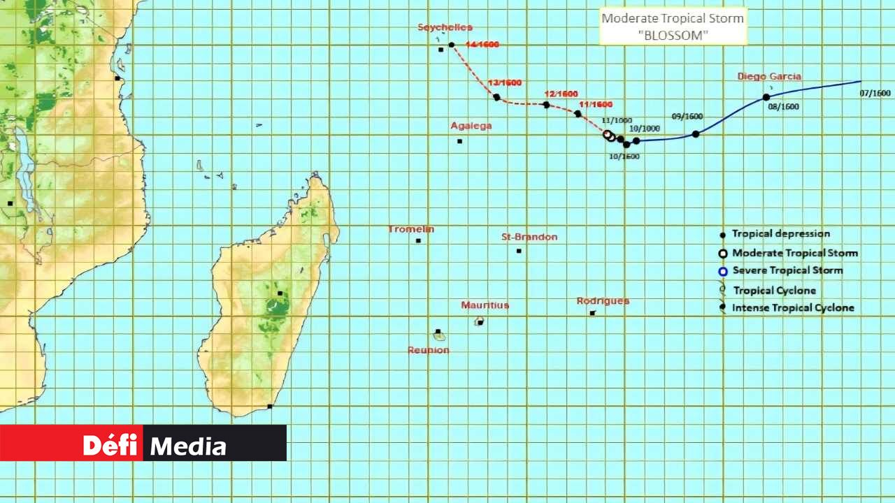 La dépression tropicale qui évoluait à l’est d’Agalega s’est intensifiée en une tempête tropicale modérée durant la nuit et a été baptisée « BLOSSOM » par les services météorologiques de Maurice à 04h00 ce matin.