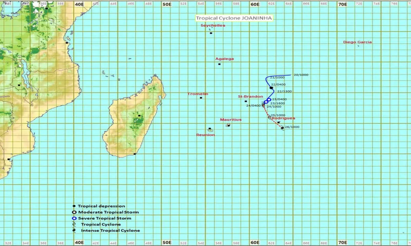 A 4 h ce matin, le cyclone tropical Joaninha était centré à environ 370 km au nord-nord-ouest de Rodrigues, soit en latitude 16.9 degrés sud et longitude 61.6 degrés est. Il est prévu que le cyclone se déplace lentement vers le sud pour ensuite s'incurver vers le sud-est dans la soirée. Sur cette nouvelle trajectoire, le cyclone tropicale Joaninha s'approchera de Rodrigues tout en s'intensifiant davantage. Joaninha représente une menace sérieuse pour l’île.
