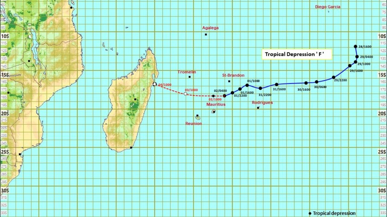 Sur cette trajectoire, le système tropical s'approche de Maurice et représente une menace potentielle pour l'île. Un léger infléchissement de la trajectoire vers le sud-ouest pourrait rapprocher son centre de Maurice.