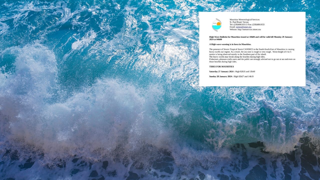 La station météorologique de Vacoas a émis ce samedi un avis de fortes houles pour Maurice ; avis valable jusqu'au lundi 29 janvier à 04 h.