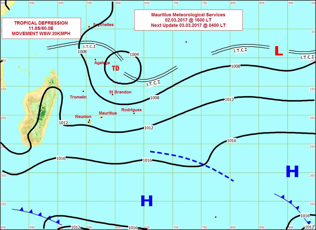 La perturbation tropicale, qui evolue au sud-est d'Agalega s'est intensifiée en une depression tropicale. A 16 heures ce jeudi 2 mars, elle se trouvait à environ 915 km au nord de Maurice.