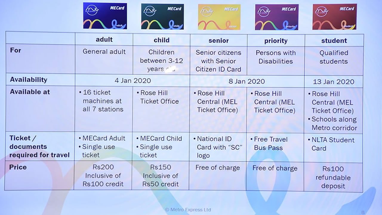 Les ME-Card seront distribuées gratuitement aux personnes âgées et handicapées le 8 janvier prochain. Ils devront se munir de leur carte d’identité et de leur ‘bus pass’. La distribution sera faite à la station centrale du Metro Express à Rose-Hill.