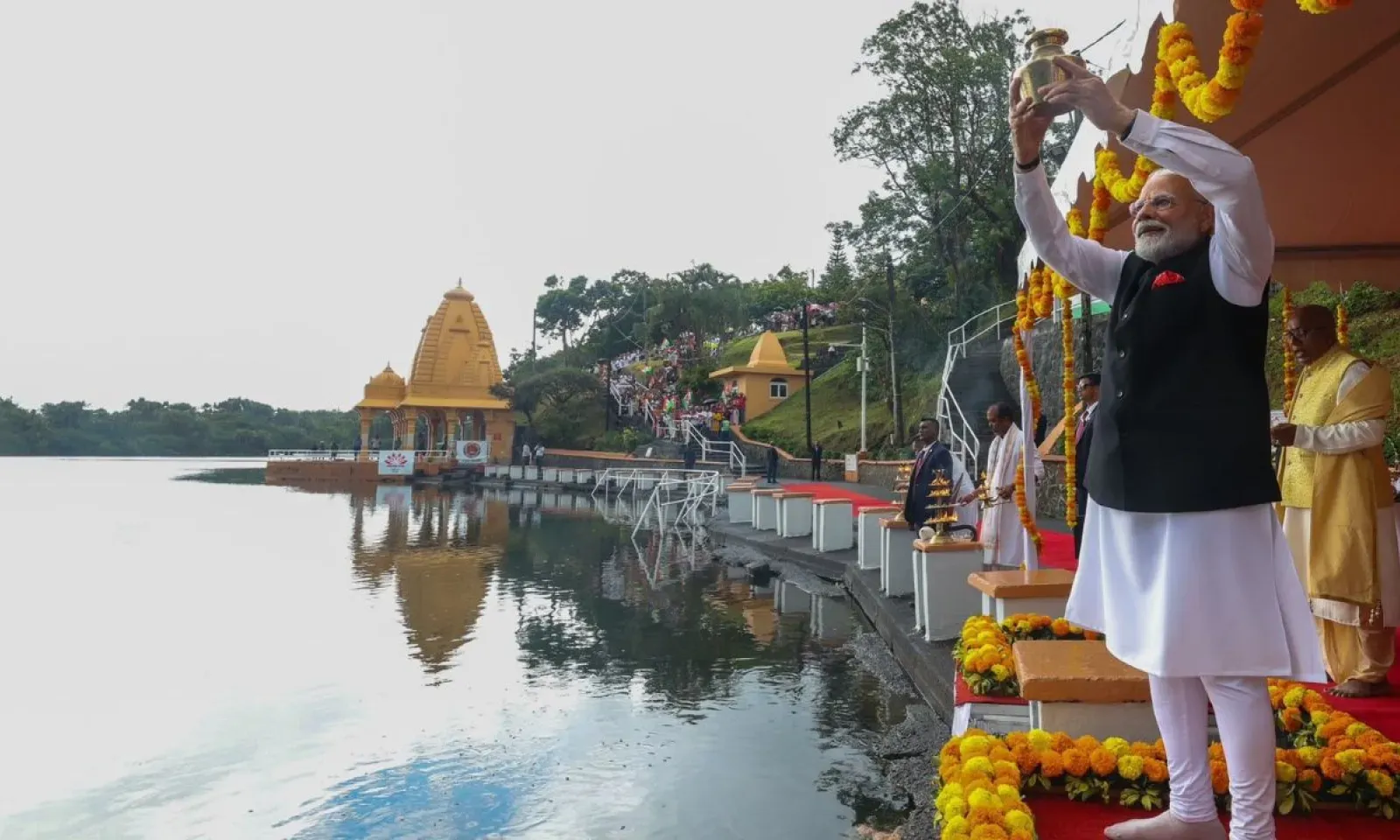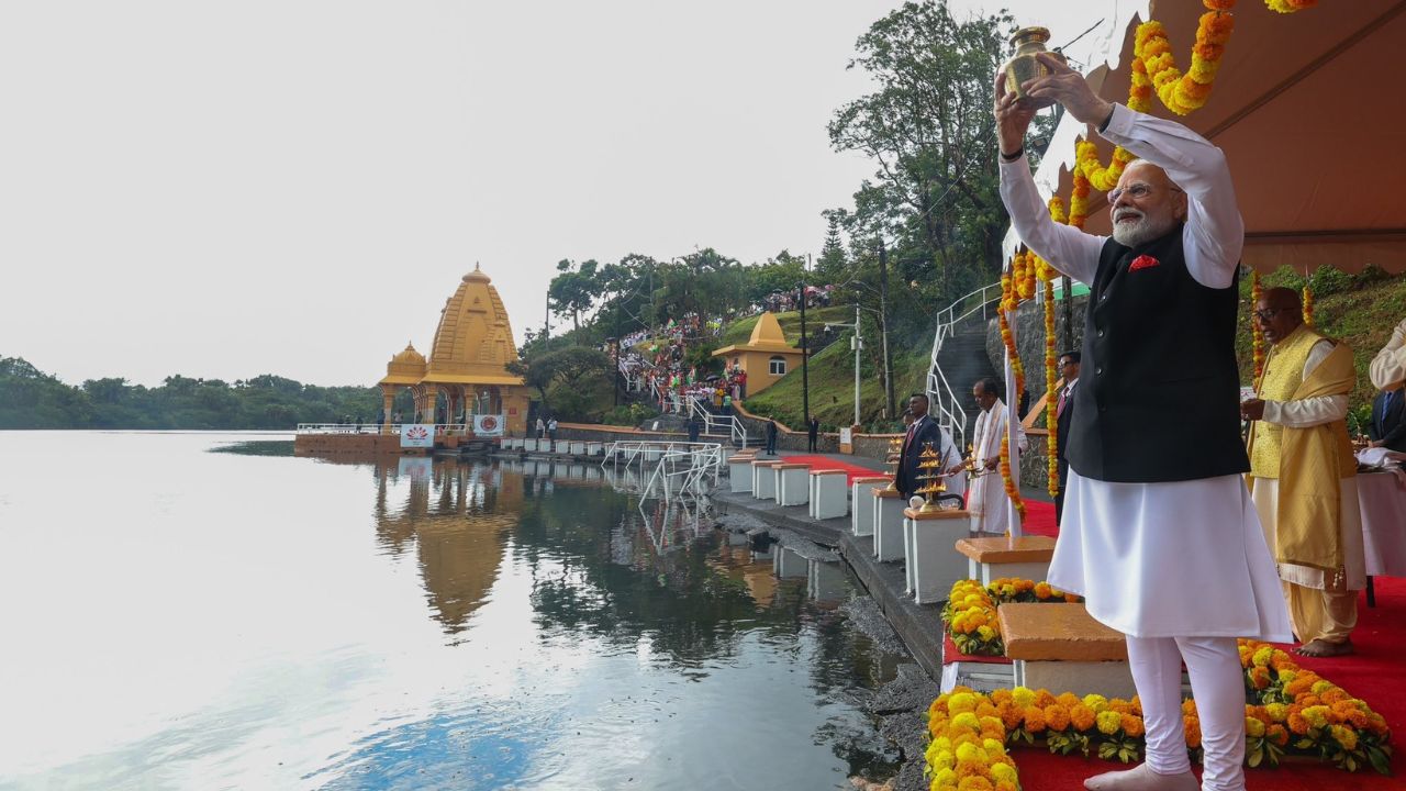 La veille, lors de la « Community Reception », Narendra Modi avait annoncé son intention de verser l'eau sacrée recueillie au confluent des fleuves Ganga, Yamuna et Saraswati lors du Sangam Maha Kumbh Mela, dans le Ganga Talao. Cet événement spirituel et symbolique pour les hindous, qui se tient tous les 144 ans, s'est déroulé du 13 janvier au 26 février de cette année.