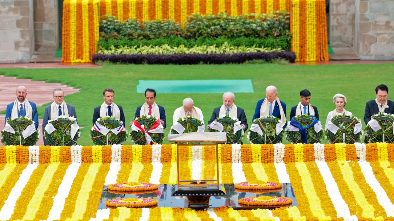 Les dirigeants du G20, dont le Premier ministre britannique Rishi Sunak et le président français Emmanuel Macron, ont été ensuite invités à rejoindre, pieds nus, M. Modi, devant une plaque de marbre noir, toute ornée de guirlandes d’œillets d'Inde orange et jaune. Là, une flamme éternelle célèbre la mémoire de l'apôtre indien de la non-violence.