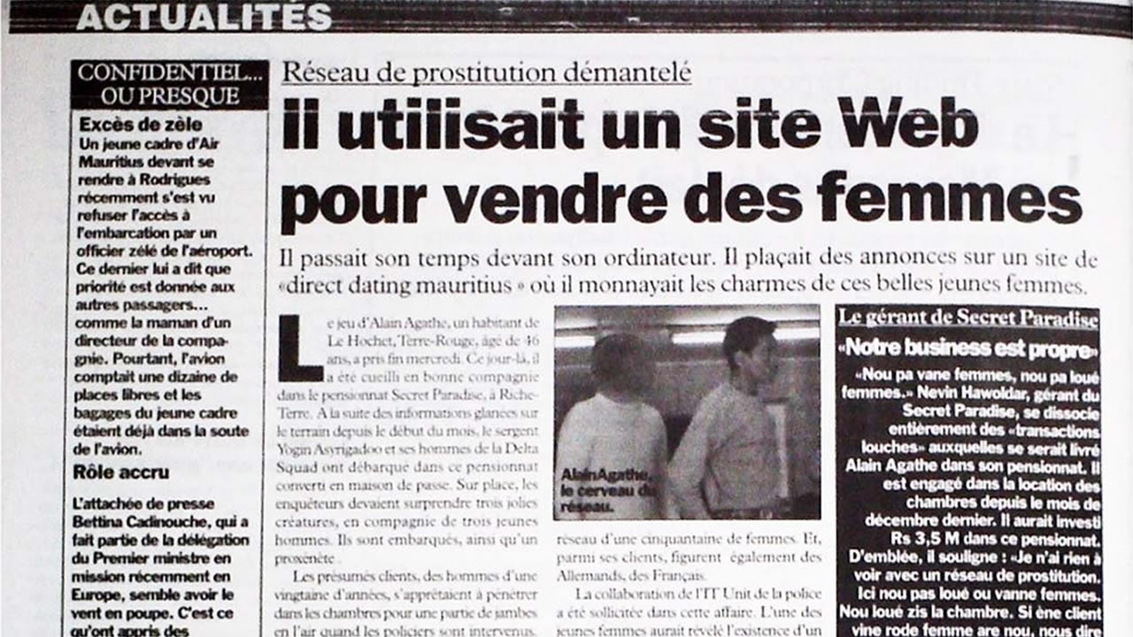 À l'étage où il réside à Terre-Rouge, Alain Agathe avait aménagé plusieurs chambres climatisées, comme un pensionnat. Cependant, le propriétaire ne possède aucune autorisation de la Tourism Authority pour exploiter une Guest House. Dans deux pièces différentes de cette maison close, deux Malgaches monnaient leurs charmes contre paiement. Leurs clients sont des Mauriciens. Natacha R., (31 ans) et Lalaina A., (33 ans) ainsi que le Bangladais Sazzad Muhammad, alias Alex, ont été arrêtés.