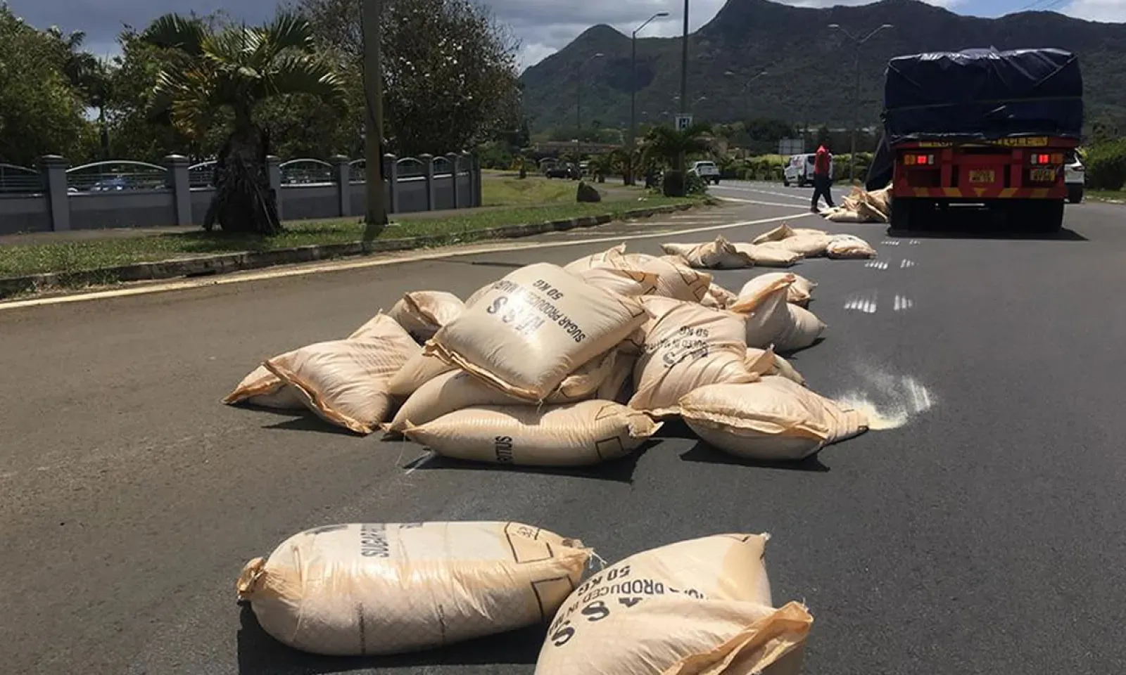 Scène inhabituelle ce lundi 14 octobre à Moka non loin de l’hôpital Wellkin. Des sacs de sucre sont tombés d’un poids lourd et se sont retrouvés sur la chaussée.