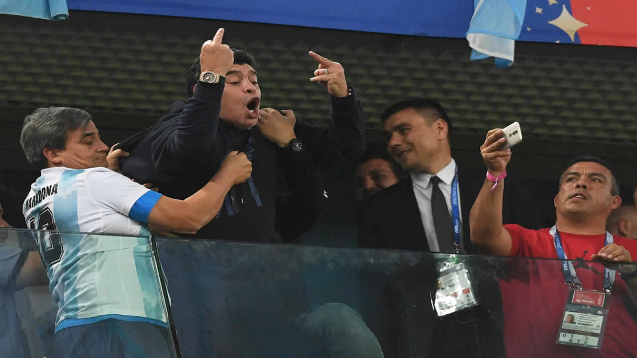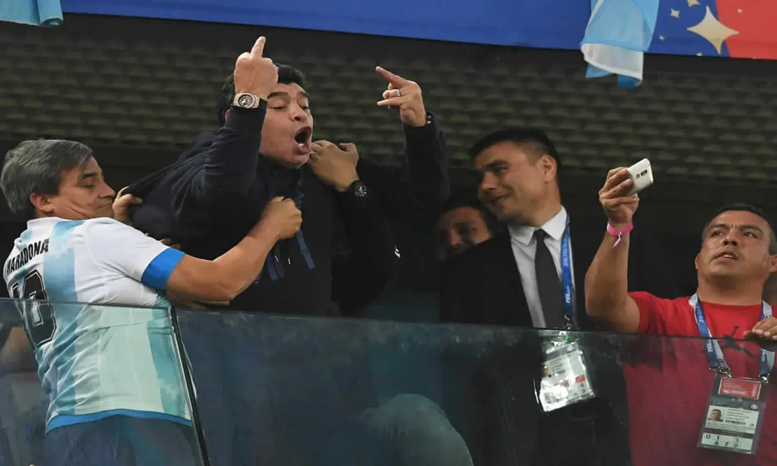 Le premier but inscrit par Lionel Messi (14e) a précipité "El Diez", 57 ans, dans l'euphorie, et l'a brutalement sorti d'une sieste en mondovision. Les bras croisés sur la poitrine, debout sur son siège, il a même dû être retenu par des gardes du corps pour lui éviter de passer par-dessus la balustrade en verre.