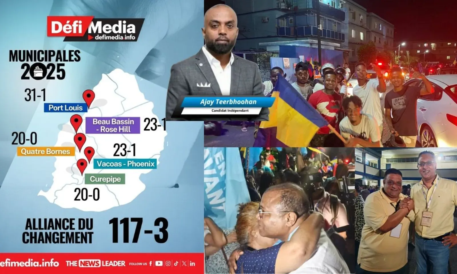 L’Alliance du Changement a obtenu 117 sièges de conseillers municipaux répartis dans les cinq villes de l’île (Port-Louis, Beau-Bassin/Rose-Hill, Vacoas/Phoenix, Curepipe et Quatre-Bornes).