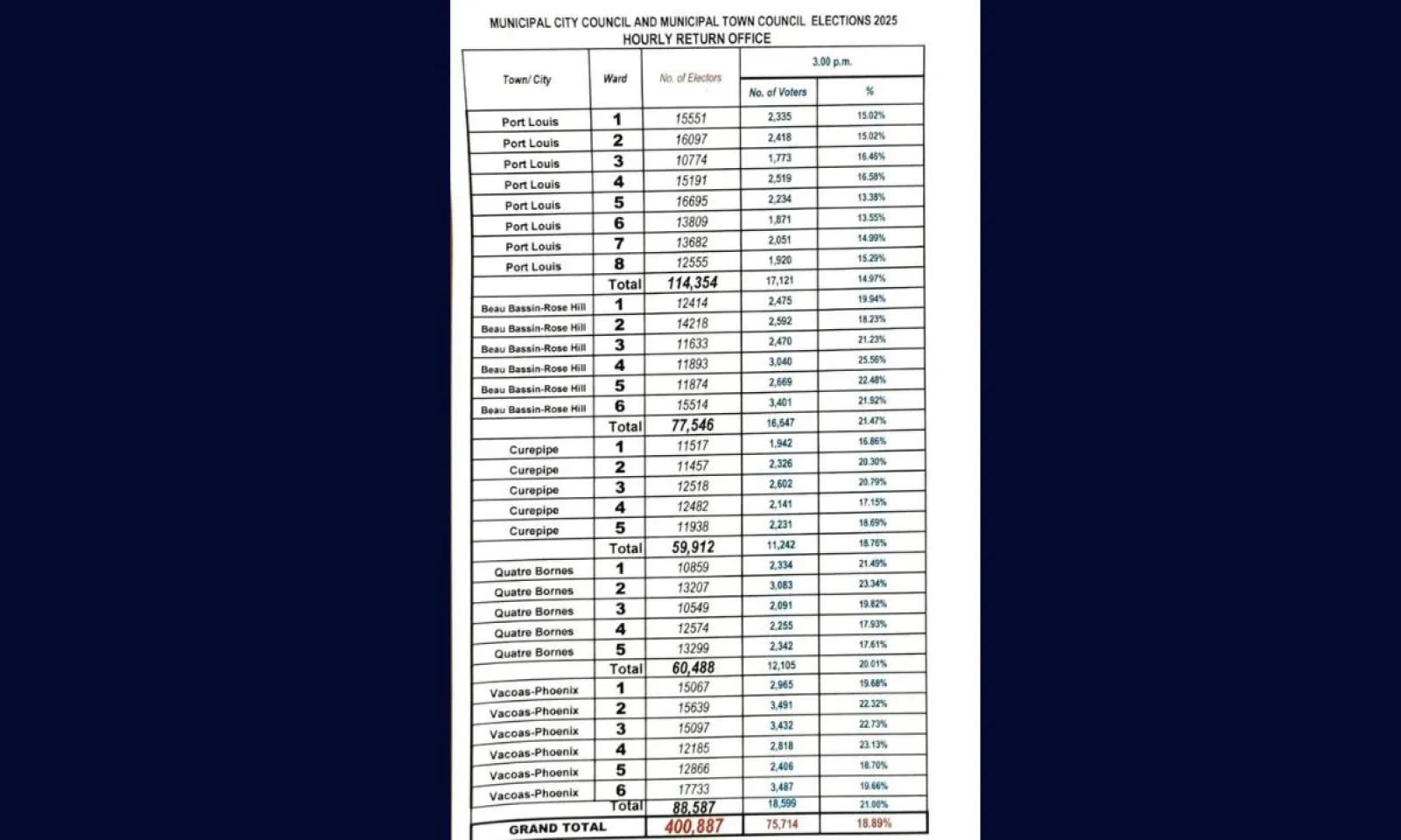 À moins de deux heures de la fermeture des centres de vote, 75 714 citadins sur les 400 887 inscrits avaient accompli leur devoir civique, ce qui représente un taux de participation de 18,89 %. Ces chiffres ont été communiqués par la Commission électorale à 15 h, ce dimanche 4 mai, dans le cadre des élections municipales.