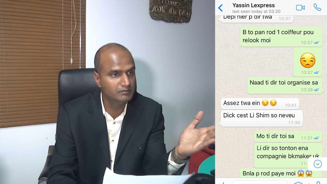 L’express a barré sa Une, vendredi, avec une capture d’écran faisant état d'un échange téléphonique sur WhatsApp entre Husein Abdool Rahim et le journaliste Yasin Denmamode, affirmant que Radio Plus a fait des « propositions d'argent » à celui qui a dénoncé Ravi Yerrigadoo, Sylvio Sundanum et Dick Kwan Tat. Sur cette image, on peut lire cet échange entre les deux hommes sur les appels que Husein Abdool Rahim a reçus. « Banla pe rod pey mwa », lance le dénonciateur, alors que Yasin Denmamode lui demande « kisanla », « inn call twa », « inn send mesaz ». À cela, Husein Abdool Rahim répond : « Radio Plus pou gayn info ».