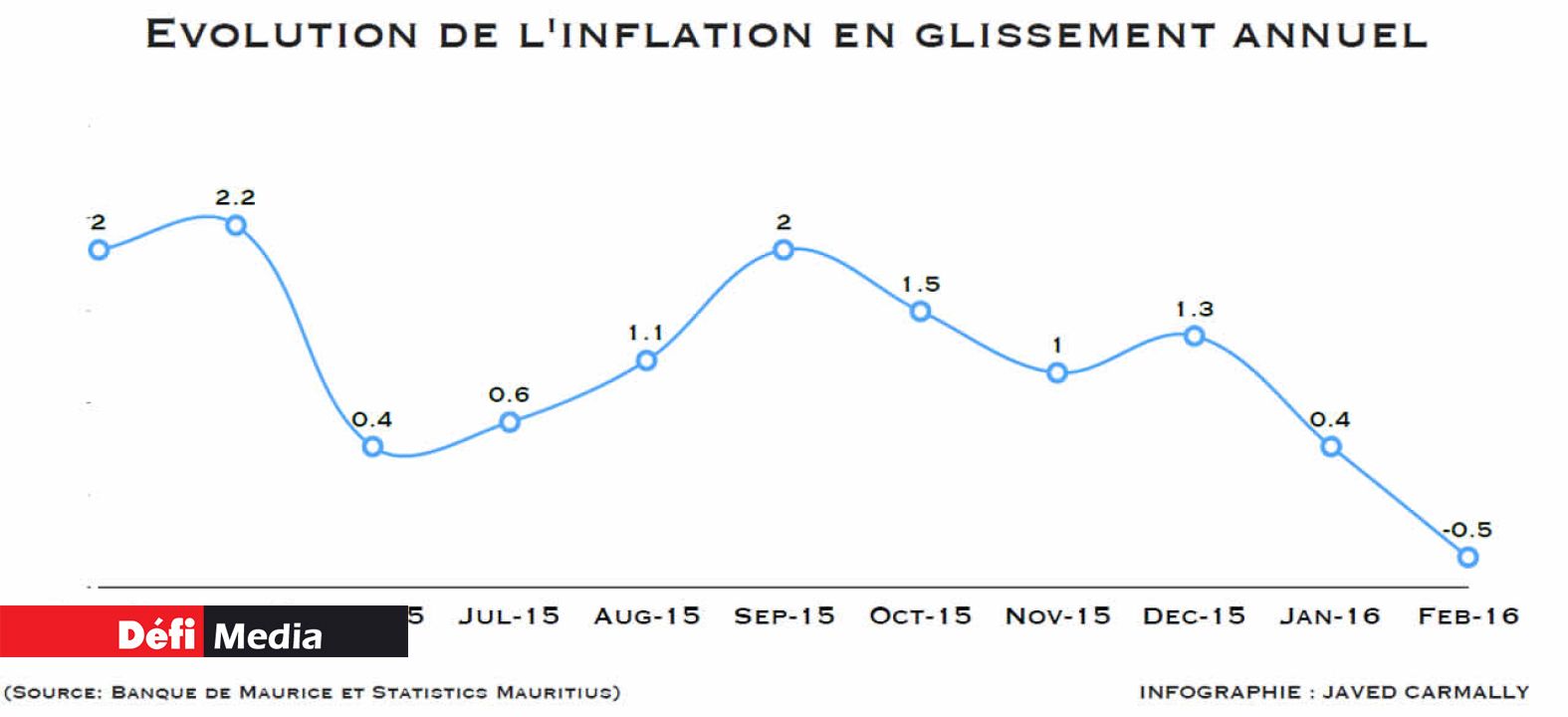 L’indice des prix à la consommation était de -0,5 % en février. C’est ce qu’indique Statistics Mauritius dans son bulletin mensuel en date du 8 mars. La dernière fois que le taux d’inflation est entré en territoire négatif remonte à janvier 1992. Selon les archives de l’agence de données, cette situation s’est produite plusieurs fois dans les années 80’.